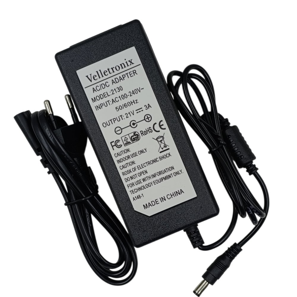 محوّل Velletronix بخرج 21 فولت 3 أمبير مع جاك 5.5×2.5 مم، مثالي لتشغيل الأجهزة التي تحتاج طاقة أعلى بكفاءة وثبات.