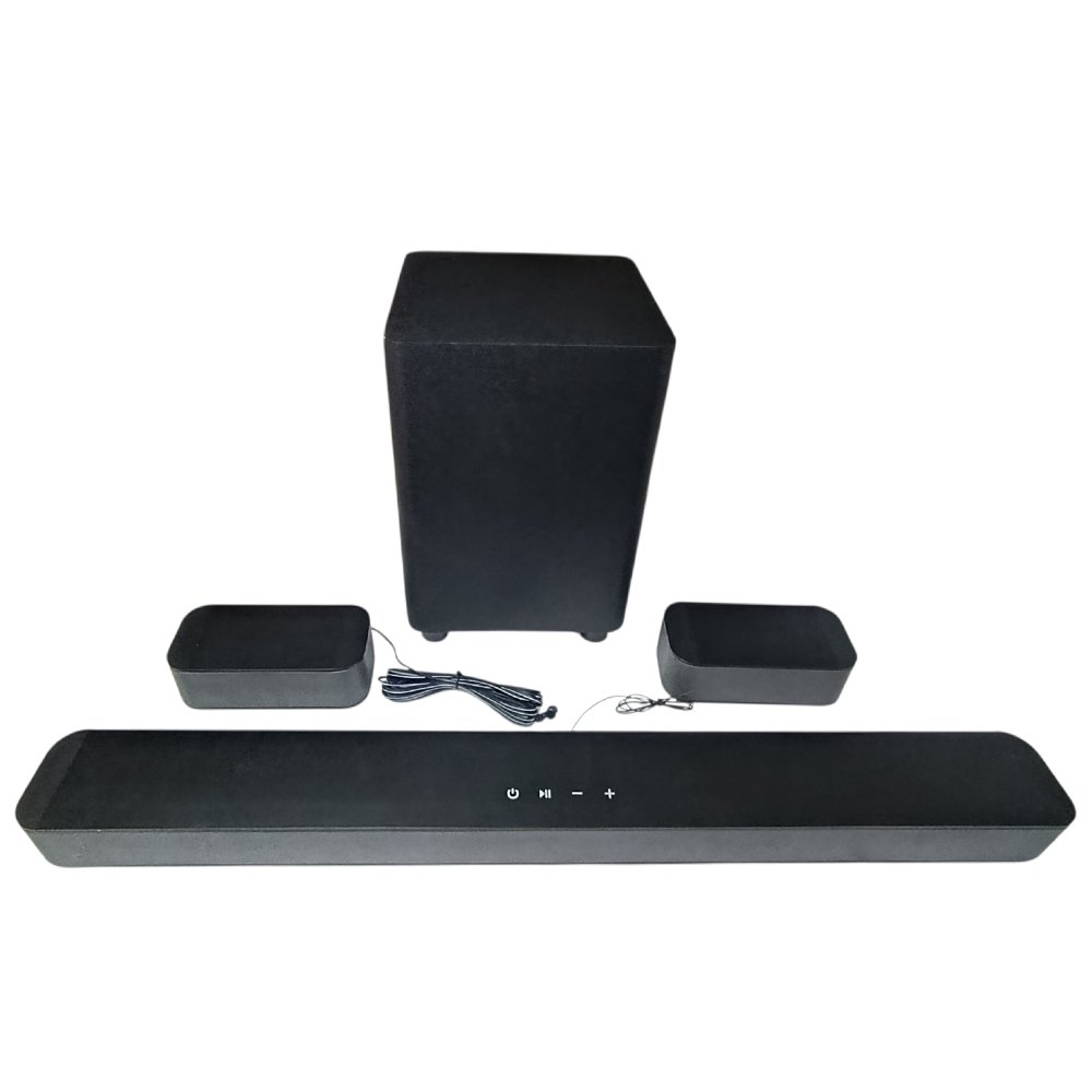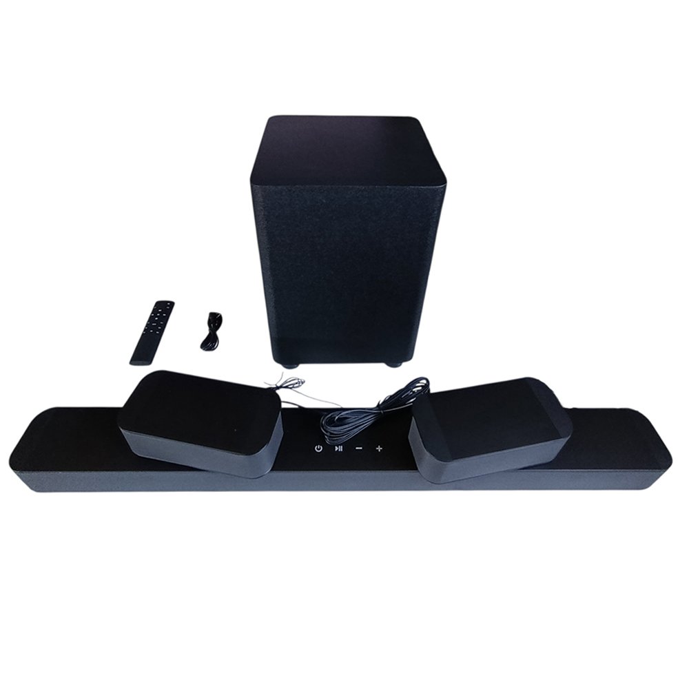 طقم مسرح منزلي متكامل بنظام 5.1 قناة يمنحك تجربة صوت سينمائية محيطية داخل المنزل، مزود بسماعة Soundbar + سبووفر + سماعات محيطية مع إمكانية توصيل وايرلس لسهولة الاستخدام بدون تعقيد الأسلاك.
