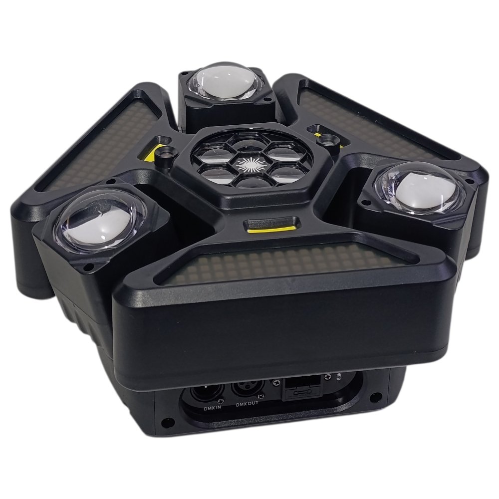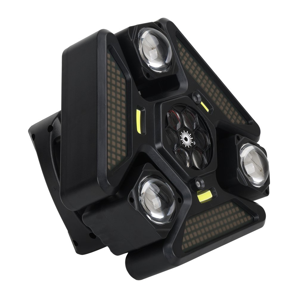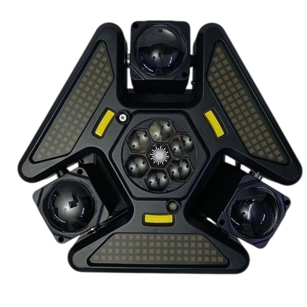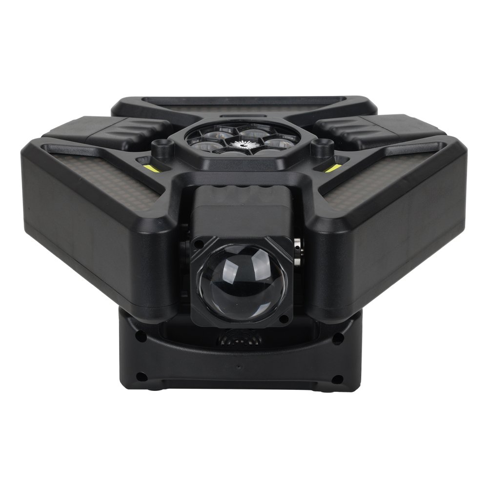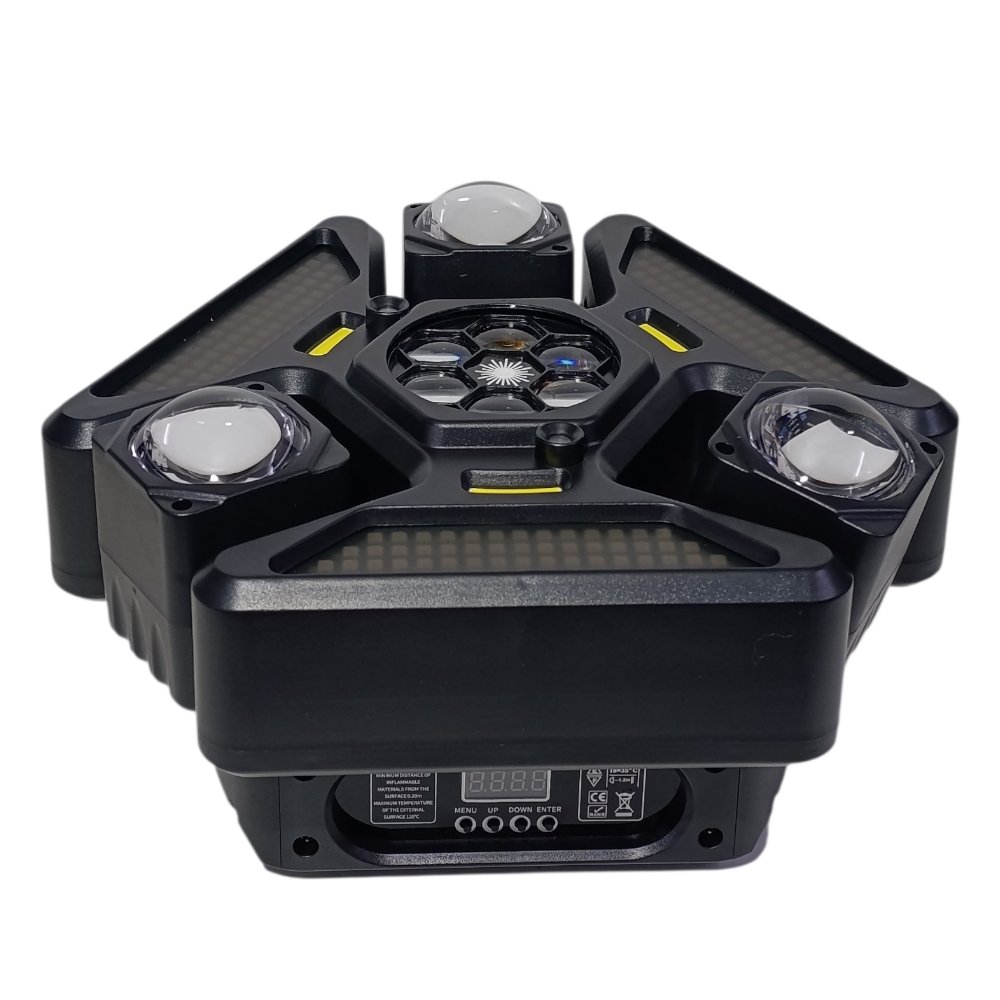 يحتوي على عدة عدسات جانبية مع إضاءة مركزية وتأثيرات إضافية، ليعطي عرض ضوئي غني بالحركة والألوان والتوزيع، مناسب للحفلات الكبيرة والعروض الاحترافية 🎉