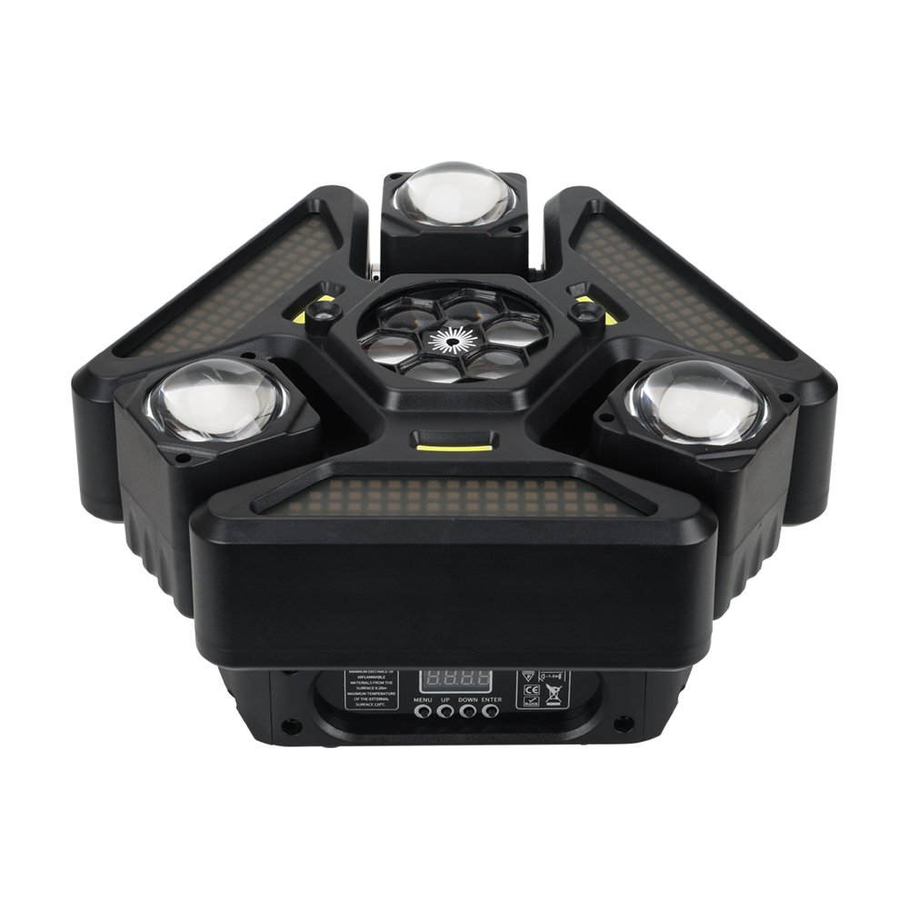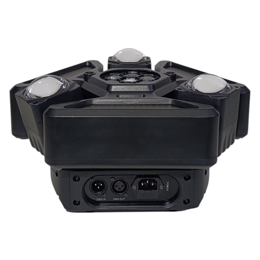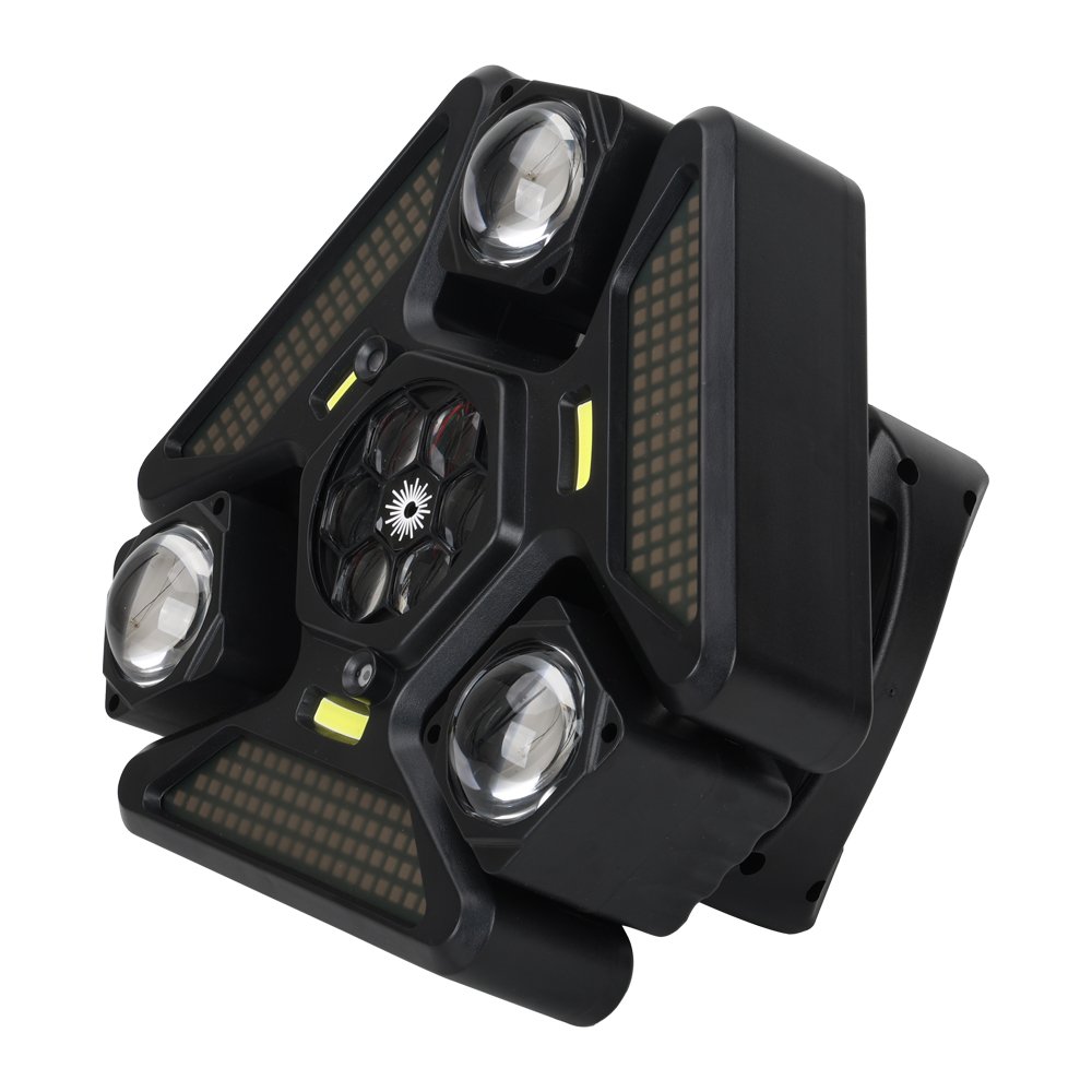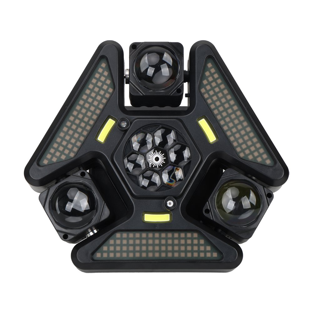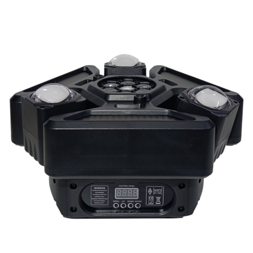 يحتوي على عدة عدسات جانبية مع إضاءة مركزية وتأثيرات إضافية، ليعطي عرض ضوئي غني بالحركة والألوان والتوزيع، مناسب للحفلات الكبيرة والعروض الاحترافية 🎉