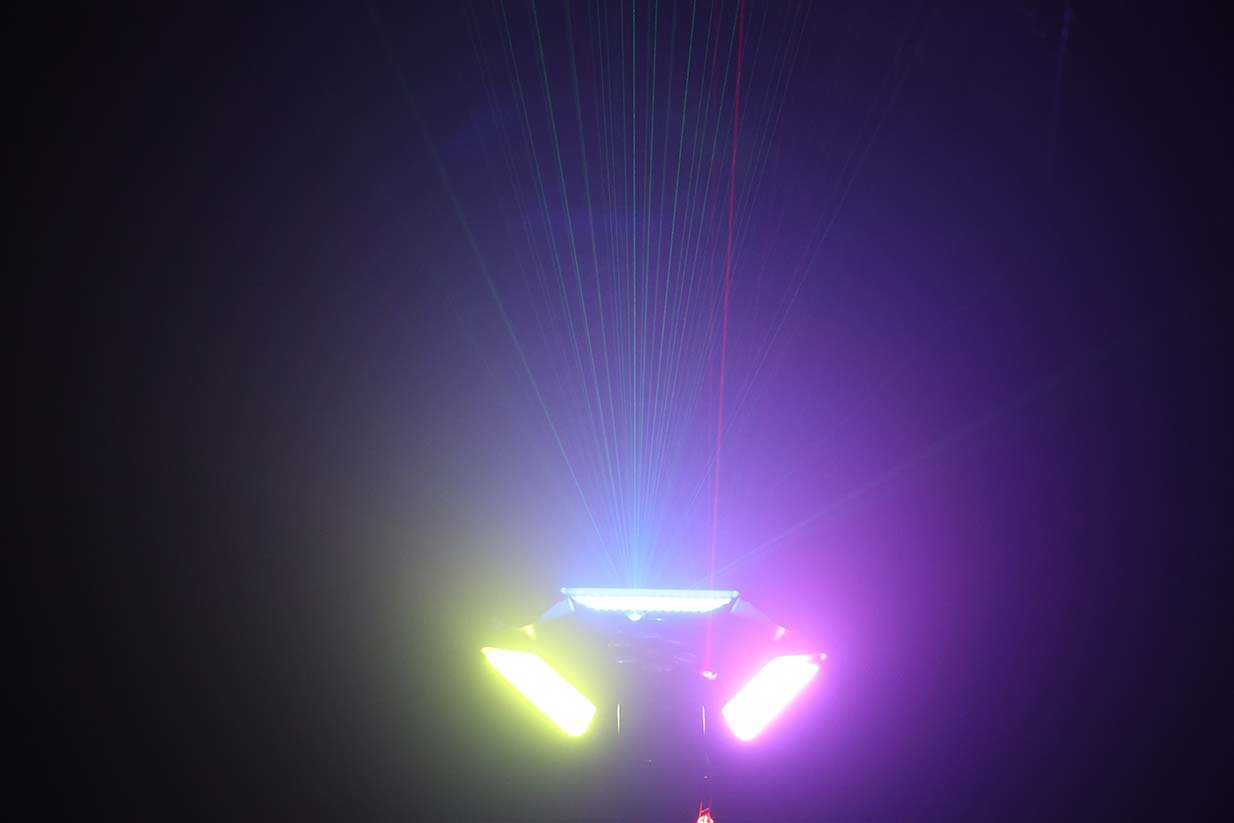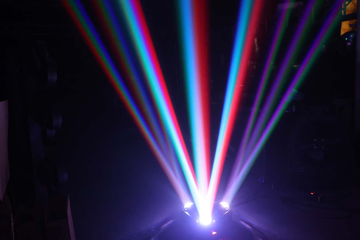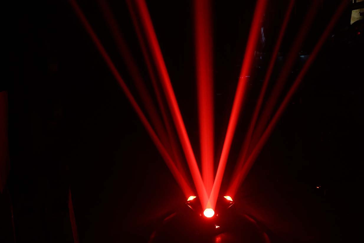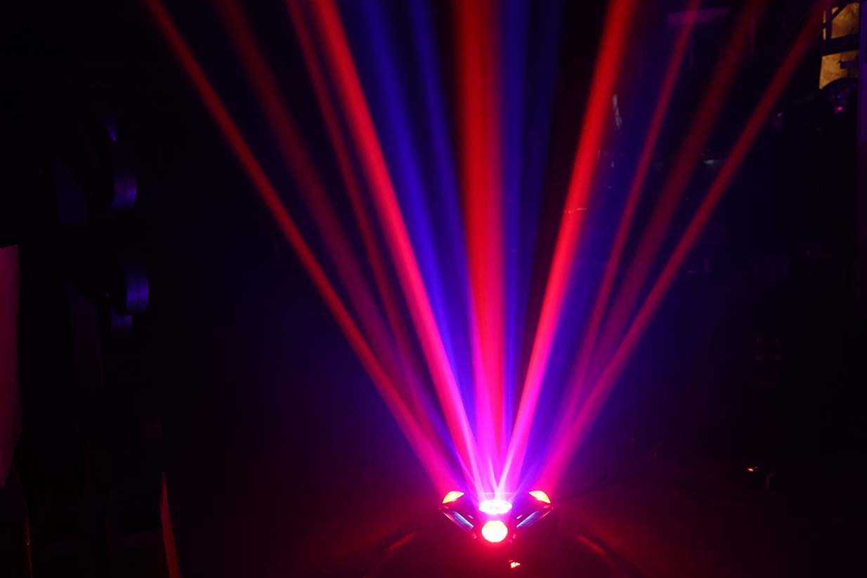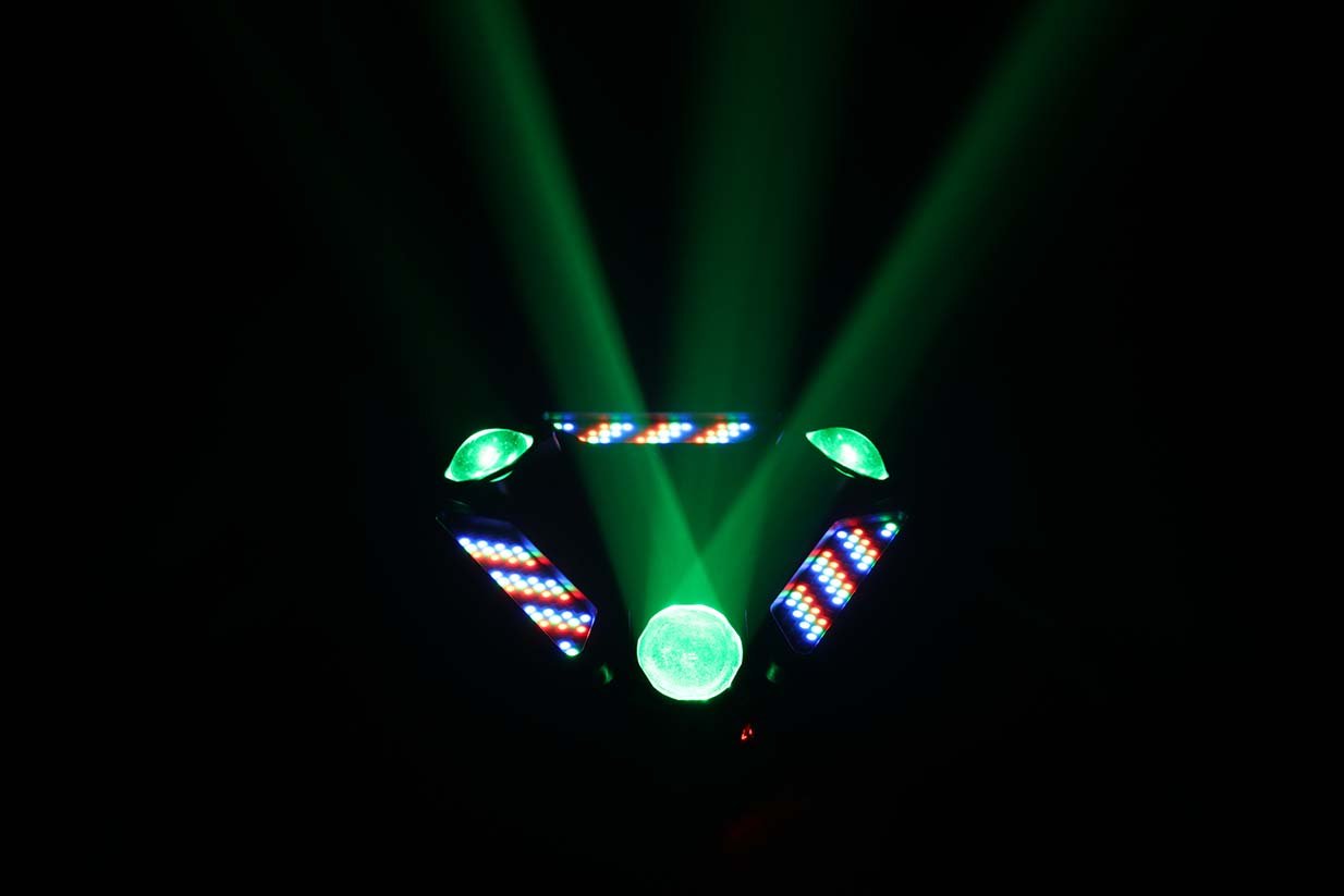 يحتوي على عدة عدسات جانبية مع إضاءة مركزية وتأثيرات إضافية، ليعطي عرض ضوئي غني بالحركة والألوان والتوزيع، مناسب للحفلات الكبيرة والعروض الاحترافية 🎉