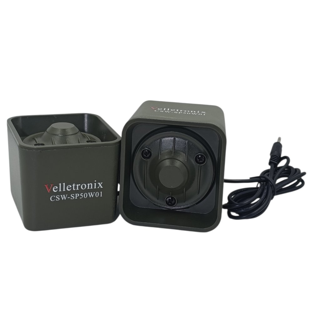 سماعة خارجية (تويتر) بقدرة 50 واط من Velletronix، تصميم مربع باللون الأخضر العسكري مناسب للبيئة البرية. توفر صوت قوي وواضح لمسافات جيدة عند استخدامها مع أجهزة نداء الطيور.