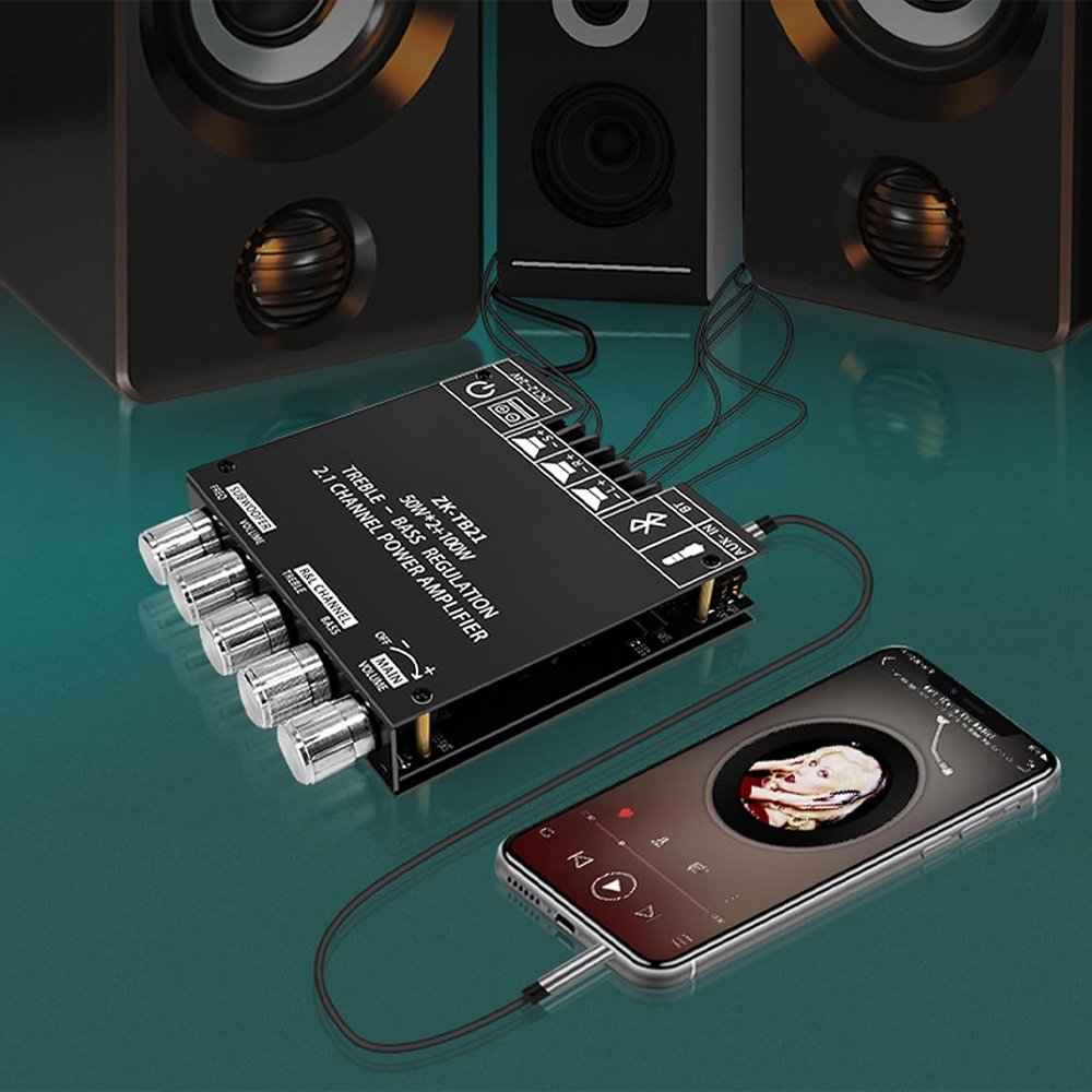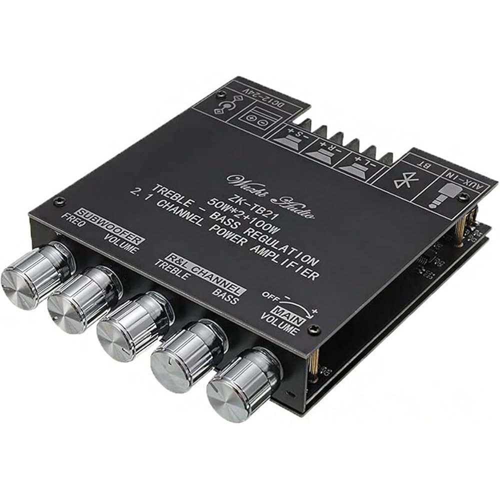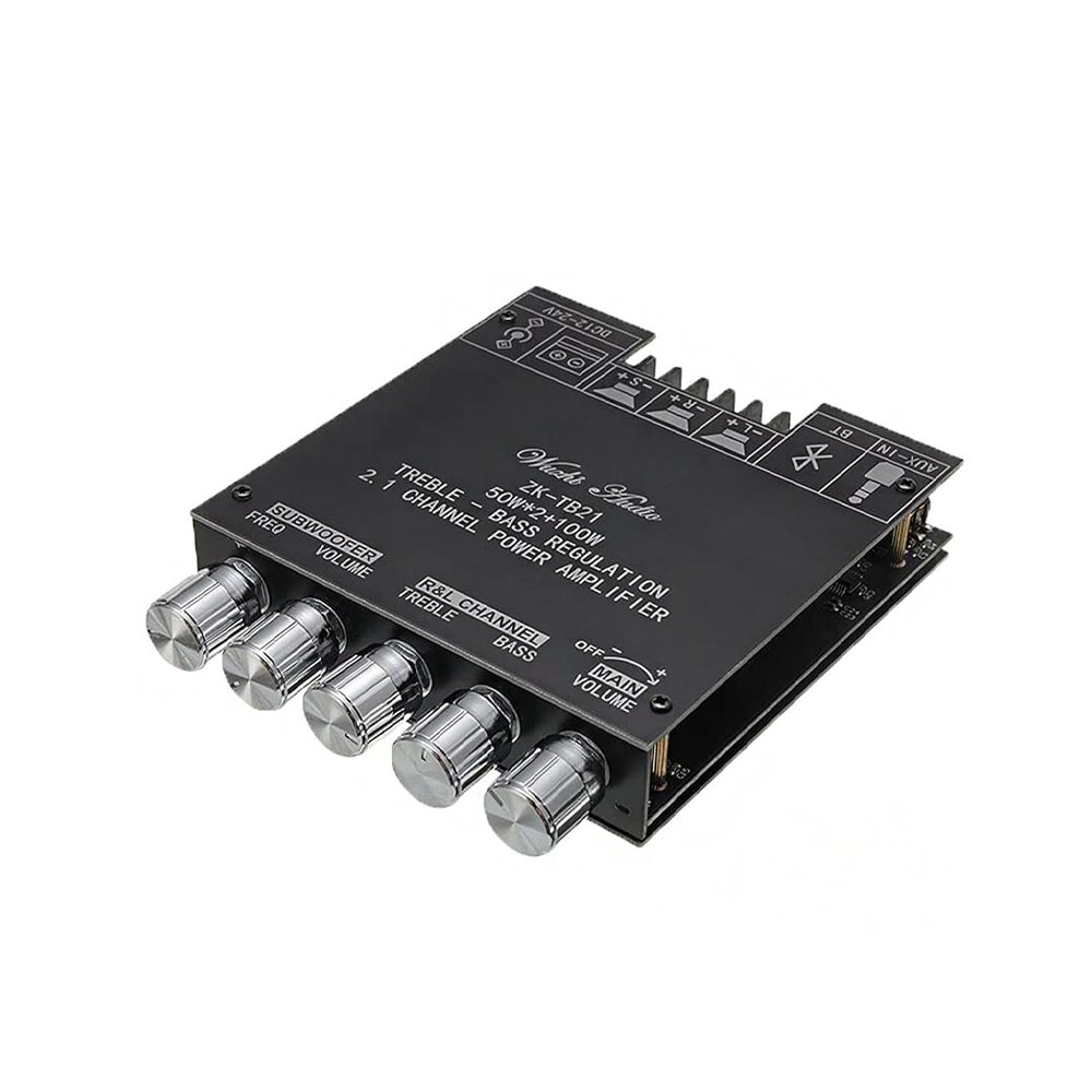 الدارة ZK-TB21 هي دارة تضخيم صوت احترافية من نوع 2.1 Channel Power Amplifier، مخصصة للحصول على صوت قوي وواضح مع إمكانية التحكم في مستوى الصوت، الجهيرات (Bass)، والحدة (Treble) بشكل منفصل لكل قناة.