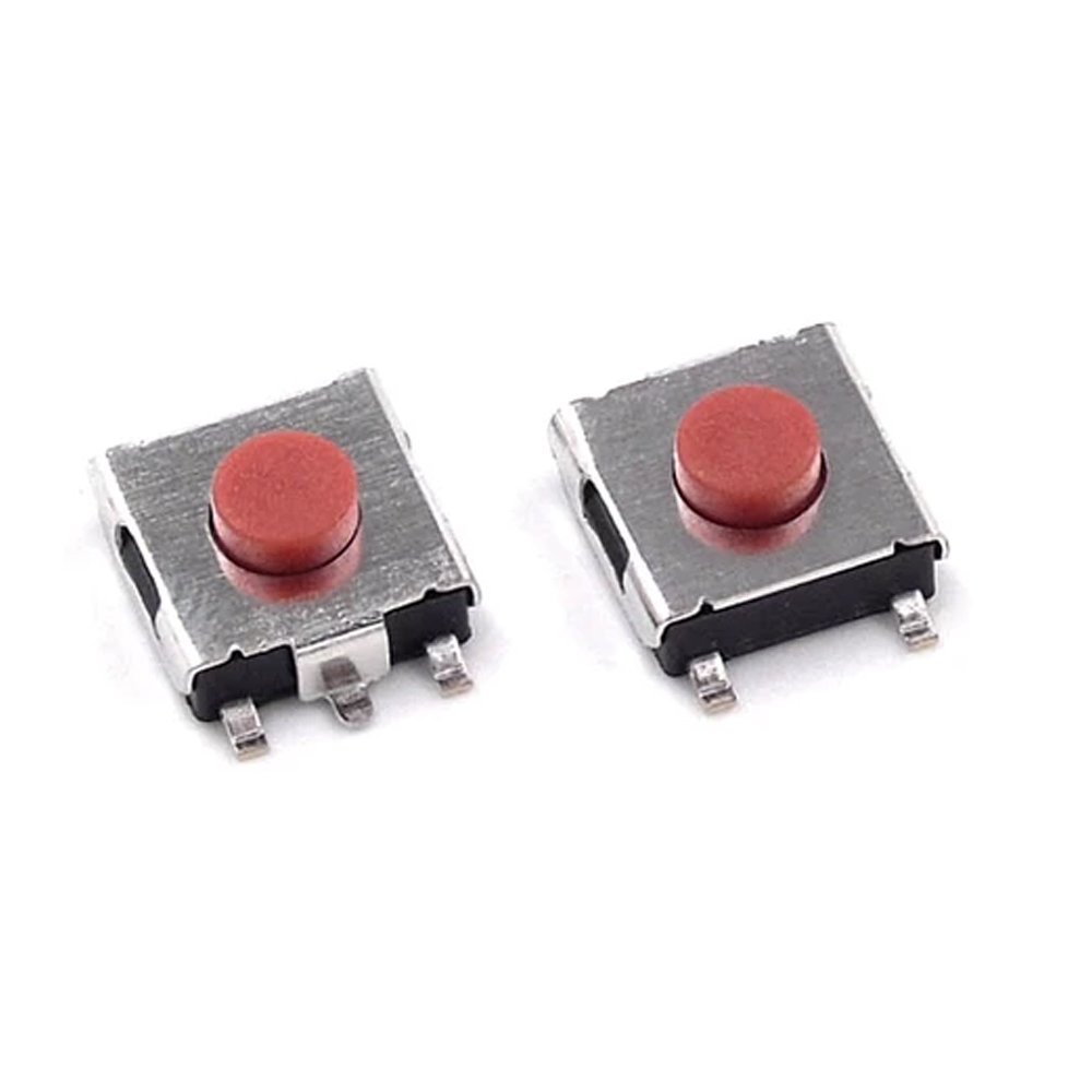 كبسة ضغط لحظية مربعة مخصّصة لمسجلات السيارة، مزودة بذراع ضغط أحمر واضح، تعمل بالضغط المؤقت، وتأتي بخمس أرجل SMD (أربع أرجل توصيل + رجل تثبيت) لضمان ثبات ممتاز على اللوحة الإلكترونية.