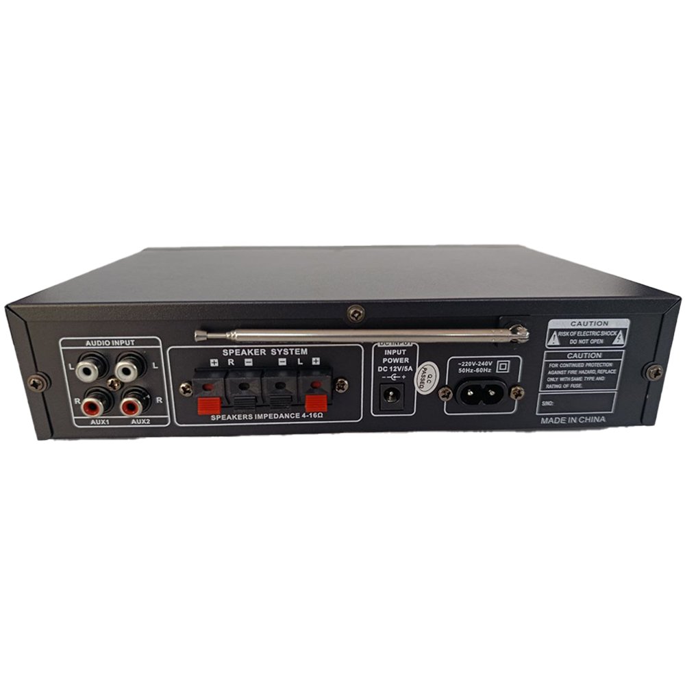 مضخم صوت ديجيتال صغير الحجم وقوي الأداء، مزوّد بتقنيات البلوتوث وUSB وSD مع إمكانية توصيل ميكروفونين، مناسب للسهرات المنزلية، الصالات الصغيرة، ومكبرات البفل الإذاعي.