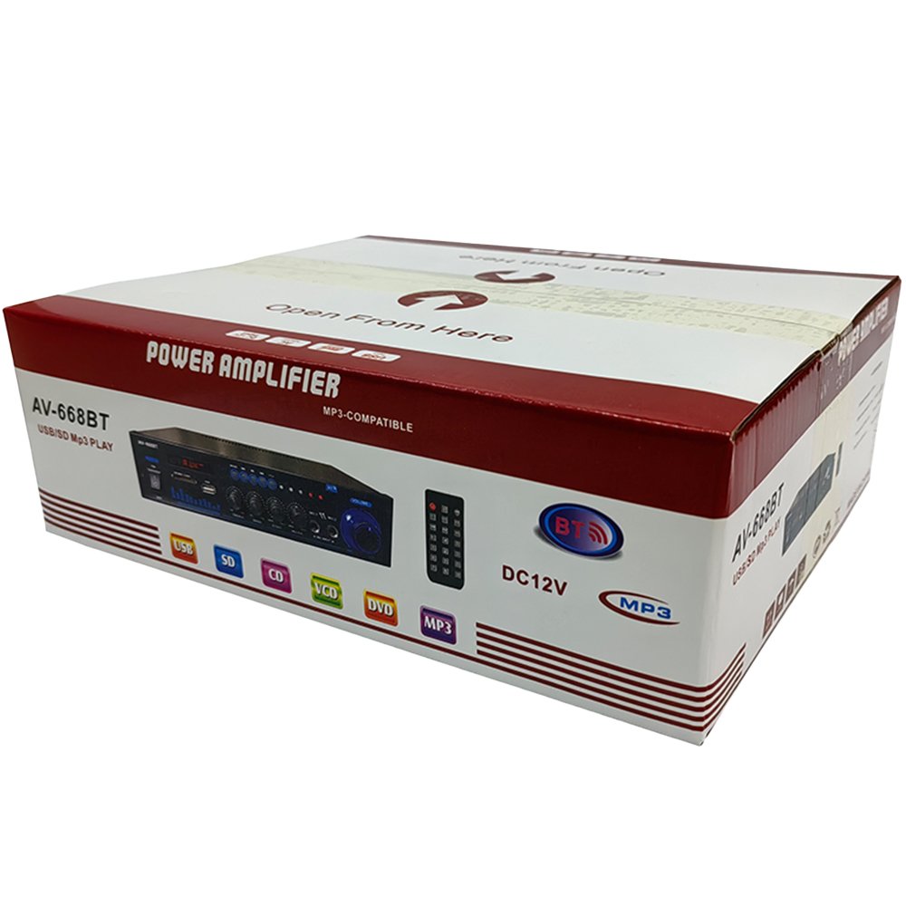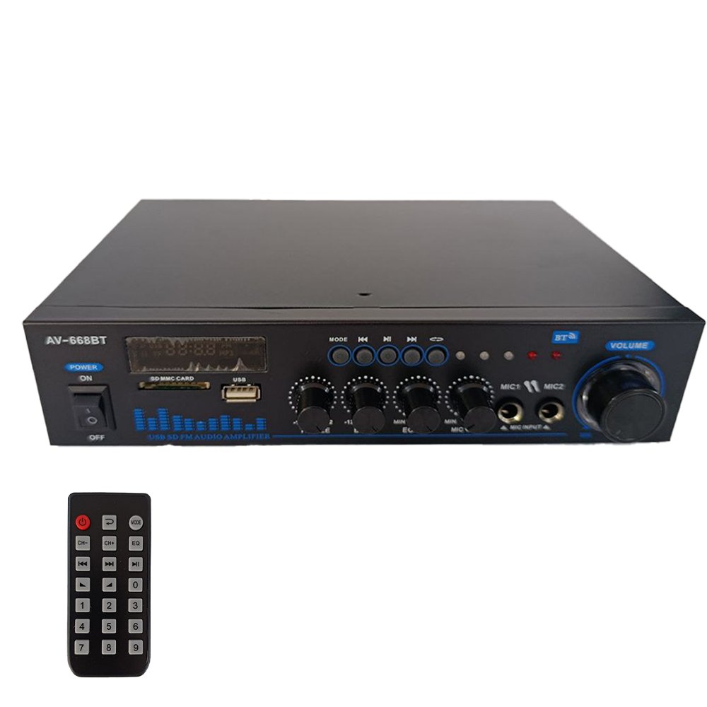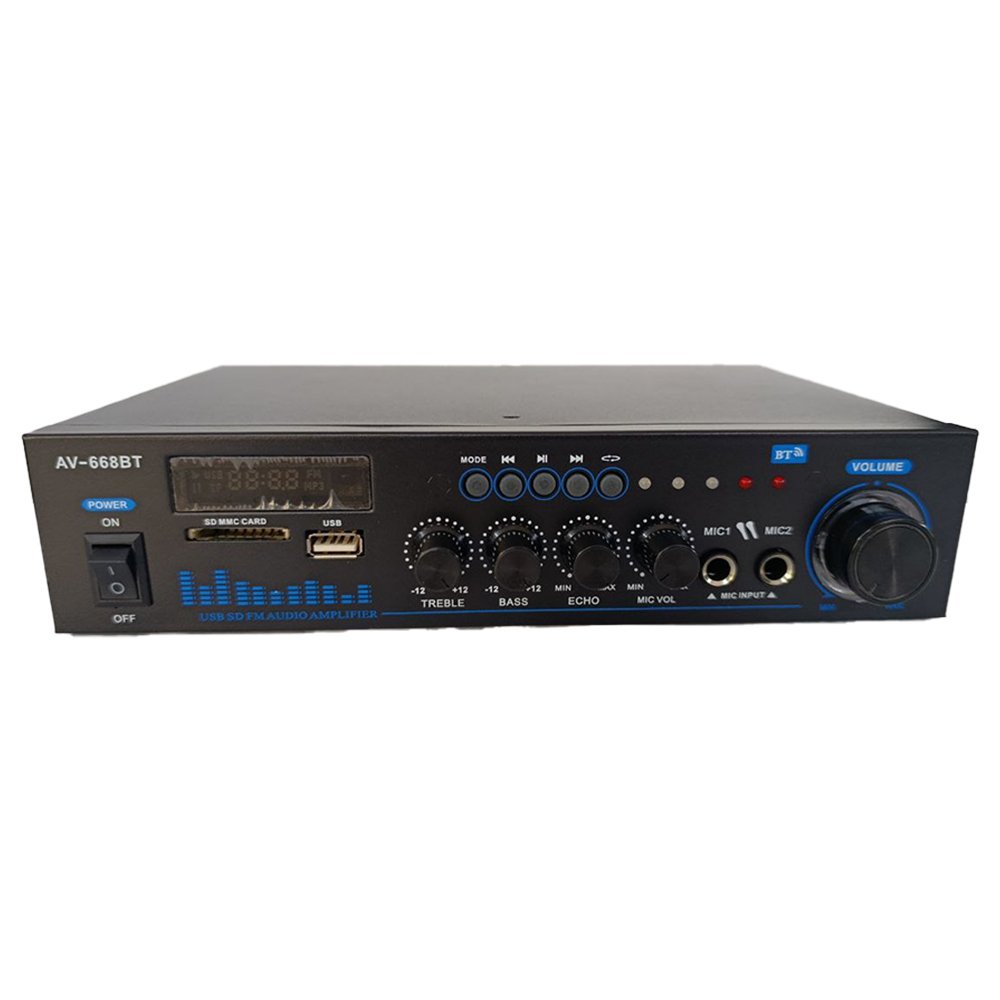 يوفّر مضخم الصوت AV-668BT أداءً صوتياً واضحاً ومتوازناً بفضل نظام التحكم الكامل في الترددات (Bass / Treble / Echo)، إضافةً لدعمه البلوتوث والـ USB مما يجعله خياراً مثالياً للاستخدام المنزلي أو التجاري. يتميز بسهولة الاستخدام وتصميم عصري مع مؤشرات LED.
