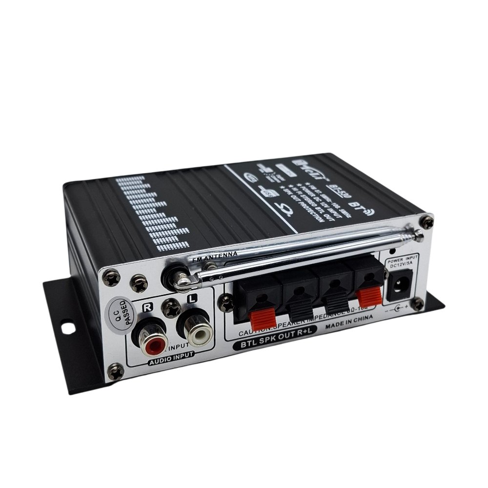 مضخم صوت ديجيتال احترافي يعمل بقدرة ممتازة رغم حجمه الصغير، يوفر تحكم كامل بالصوت (Bass – Treble – Volume) مع دعم متعدد لوسائط التشغيل مثل USB، SD/MMC، راديو FM، ومدخل AUX، بالإضافة إلى أزرار تحكم أمامية سهلة الاستخدام. مناسب للاستخدام المنزلي، المكتبي، المحلات التجارية، أو作为 مكبر إضافي بسيط للسيارات.