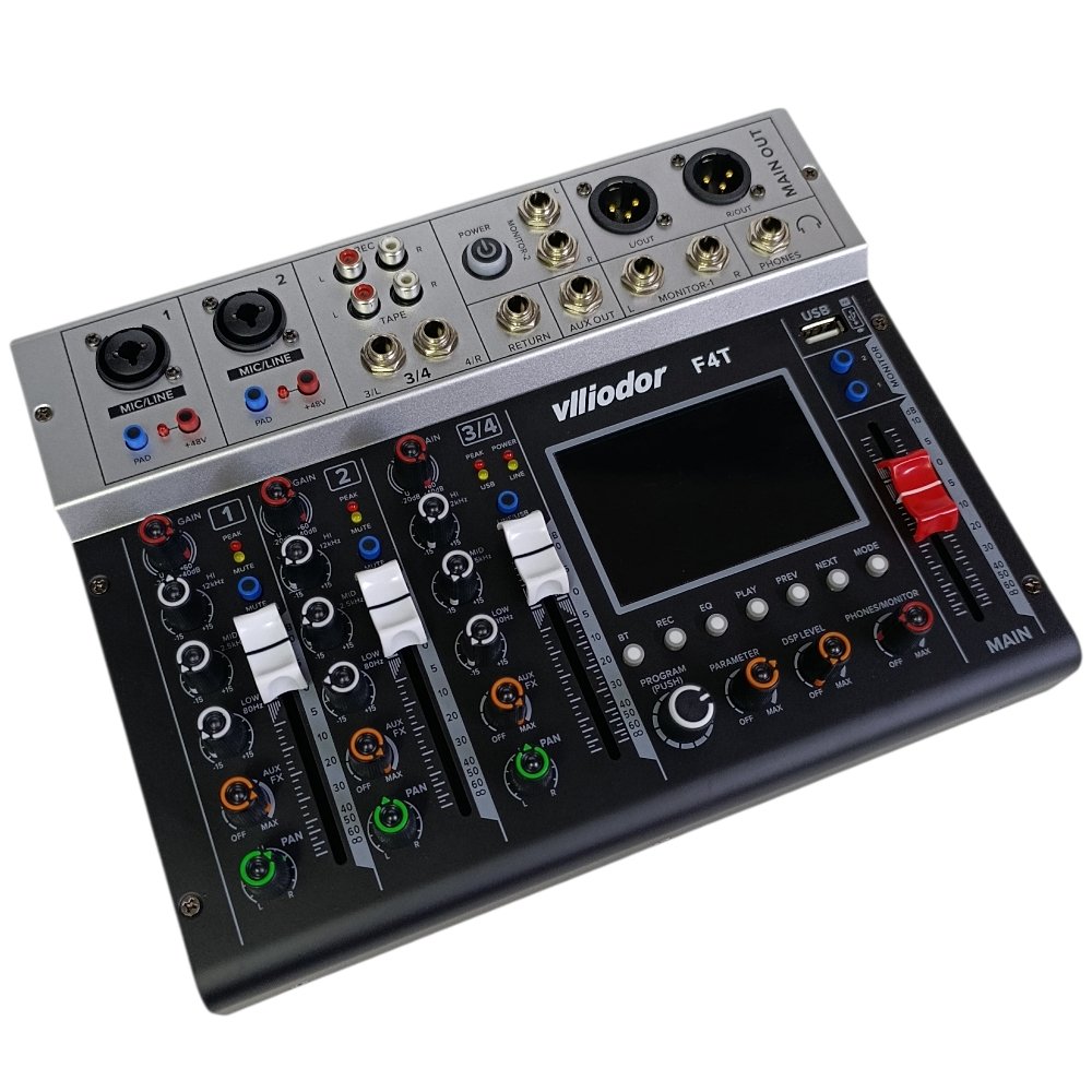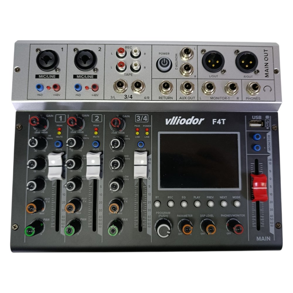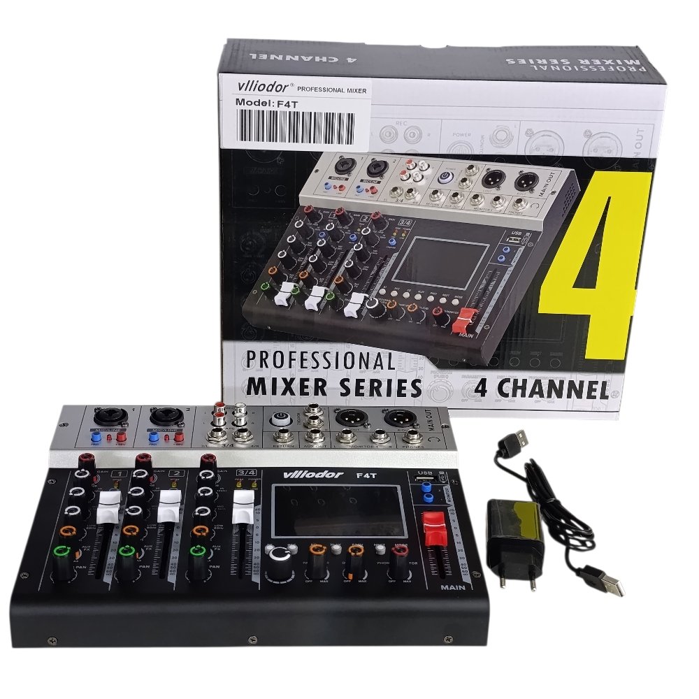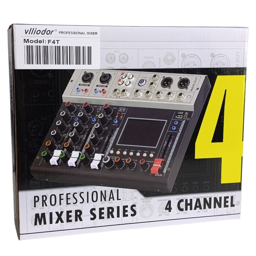 ميكسر صوت احترافي Vlliodor F4T بعدد 4 قنوات بدون مضخم، يوفر تحكم كامل وجودة صوت عالية، مثالي لأنظمة الصوت والبث والتسجيل.